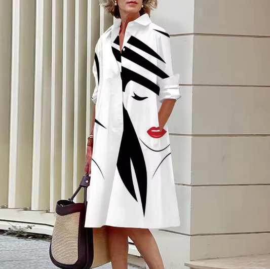 NICOLE™ | Robe chemise artistique à imprimé visage avec poches